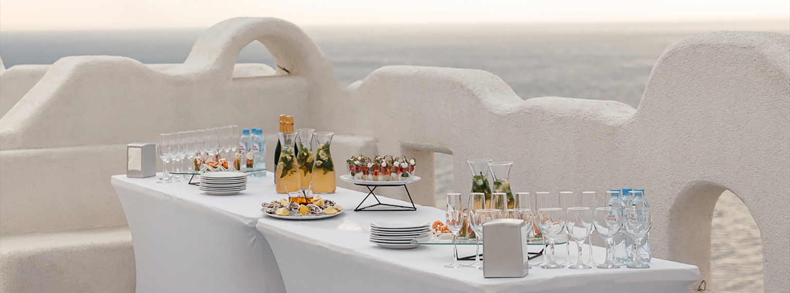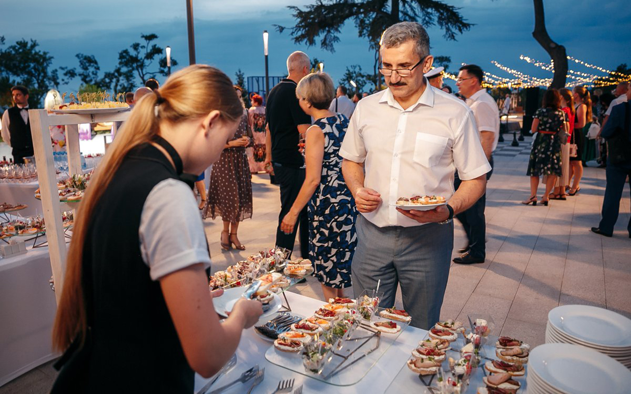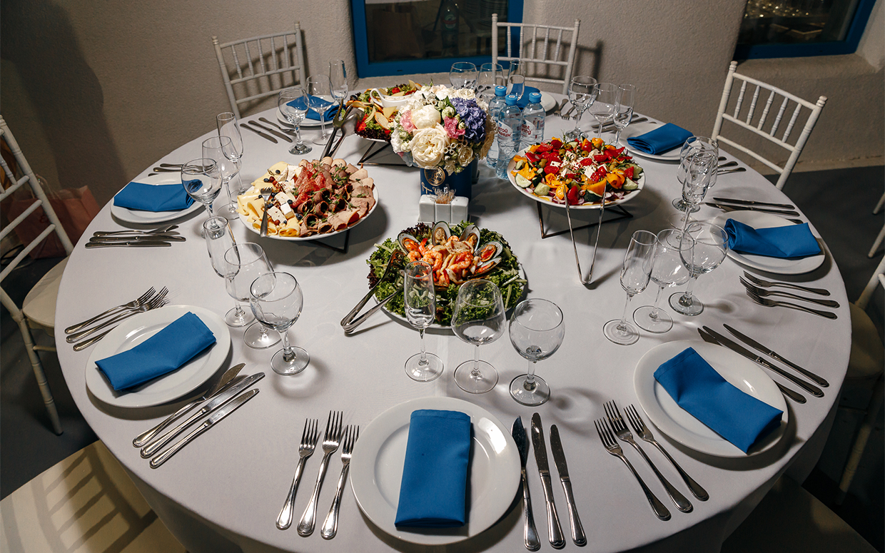 Камерный ужин на 15 человек, локация Санторини ЮБК, (выездное ресторанное обслуживание в формате банкета с wellcomeZone - фуршет)